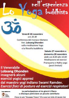 La meditazione Yoga nell'esperienza della filosofia buddhistaVenerdì 26 novembre 2010 conferenza: “La meditazione Yoga nell'esperienza della filosofia buddhista”, del Venerabile monaco tibetano Lobsang DhondenLa Pro Loco Azzate organizza tre giorni di Yoga, dalla filosofia agli esercizi pratici, con la presenza di un monaco tibetano in esilio. Tale seminario si colloca all’interno del corso di Yoga organizzato dall’Associazione verso i propri soci. Il Venerabile Lobsang Dhonden è un monaco della tradizione Gelupa, quella di sua Santità il Dalai Lama. Profugo dal Tibet, ha studiato filosofia buddhista per quindici anni all'Istituto Buddist Dialectics di Dharamsala H.P., India. Dal 1977 ha seguito come assistente personale Gheshe Yeshe Tobdhen, uno dei primi maestri dell'Istituto Lama Tsong Khapa a Pomaia, in Toscana. Lobsang Dondhen ha continuato a praticare il Buddismo in India, senza però perdere i contatti con l'Italia, dove ha mantenuto profonde relazioni con tutti i discepoli di Gheshe Yeshe Tobdhen. Ad Haridawar in India dal 2004 ha approfondito la tecnica dello yoga curativo con il maestro indiano Swami Ram Dev. E oggi Lobsang Dhonden propone in Italia questa tecnica curativa filtrata attraverso la sua esperienza buddhista.