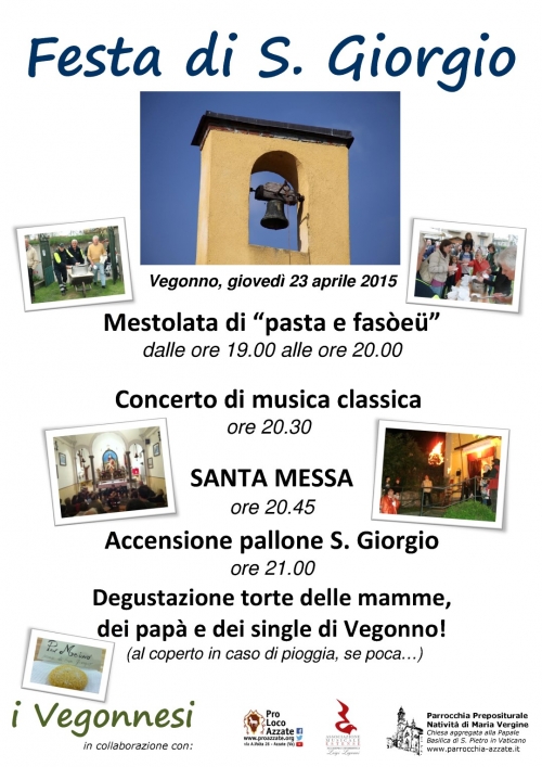 Festa di S. Giorgio a Vegonno, pasta e fasòeü, musica classica, pan meinoGiovedì 23 aprile 2015 presso la frazione di Vegonno ad Azzate (Va)