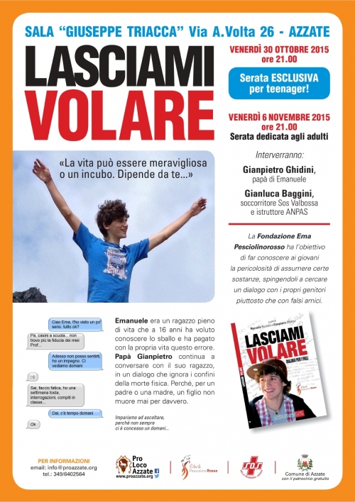 "Lasciami Volare", libro testimonianza di papà Gianpietro Ghidini, venerdì 30 ottobre ore 21.00 in sala G. TriaccaAd Azzate (Va) venerdì 30 ottobre e venerdì 6 novembre 2015, alle ore 21.00 presso la sala “Giuseppe Triacca” verrà presentato il libro “Lasciami Volare” di Gianpietro Ghidini della Fondazione Ema Pesciolinorosso. Nelle due date saranno presenti l’autore del libro Gianpietro Ghidini e Gianluca Baggini del Sos Valbossa in qualità di soccorritore e istruttore ANPAS. Evento organizzato da Pro Loco Azzate e associazione Sos della Valbossa con il patrocino gratuito del Comune di Azzate. Qui la serata, sul nostro canale YouTube: www.YouTube.com/ProAzzate